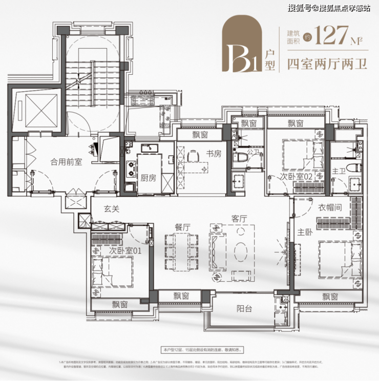 来看看更大一点的户型——建面约127㎡超阔四房,同样是南向横厅设计,并拉伸至4开间,空间舒阔。主卧套房设计,也有足够的收纳,打造专属秀场。