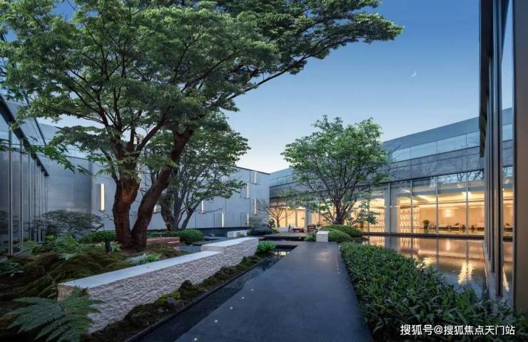 向外连接的是 下沉庭院的“古树浮桥”,水镜、古树、桥廊与围合立面共同形成一个“可停留”的自然剧场——不是装饰,而是鼓励你去使用的第三空间。