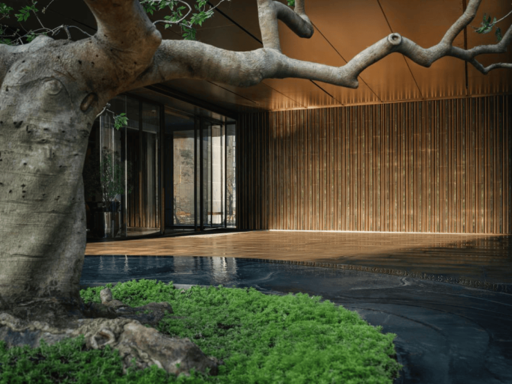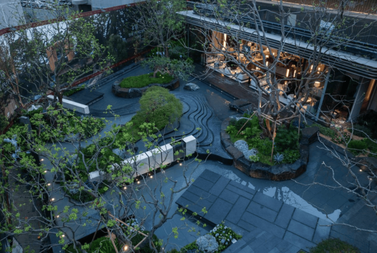 近2000㎡下沉庭院:玉扣绿岛、风籁禅境、登云之梯等多重景观共融,开创上海惟此山川溪谷立体庭园