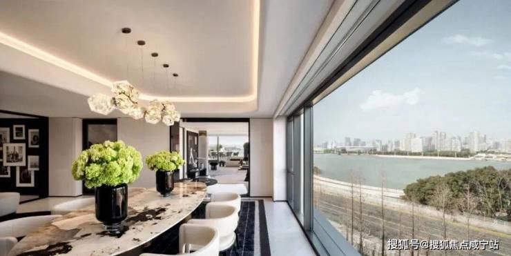 建面约239㎡边套,采用L型转角落地窗,打造了270°环幕瞰江视野,无论身处客厅、餐厅,都能以不同角度眺望黄浦江的波光粼粼。