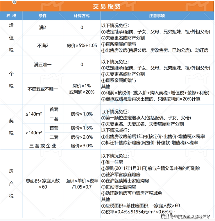 简化成易懂的语言(下面方法不精确,仅做粗略估算使用):1、增值税:持有住房满2年,增值税为0;否则,增值税=房屋交易价格x5.05%;