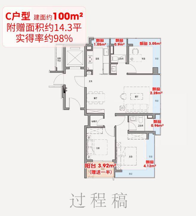 1、建面约99-102平3房中间套,实得率约91%,性价比之王!