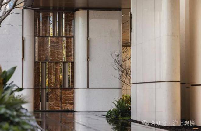 社区含“奢材”量很高。 门庭延街的外立面,以精工定制弧形 米色石材 为主调,镶嵌典藏级 老虎玉大理石 ,点缀 古铜色现代海派艺术感 灯器,整体呈现出百年海派的贵雅气质。
