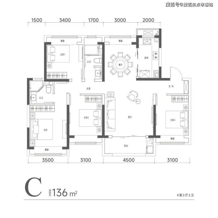 建面约136㎡客厅宽达4.5米,主卧宽3.5米,次房间分别达3.1米、3.4米,独立餐厅,靠窗南北通透。