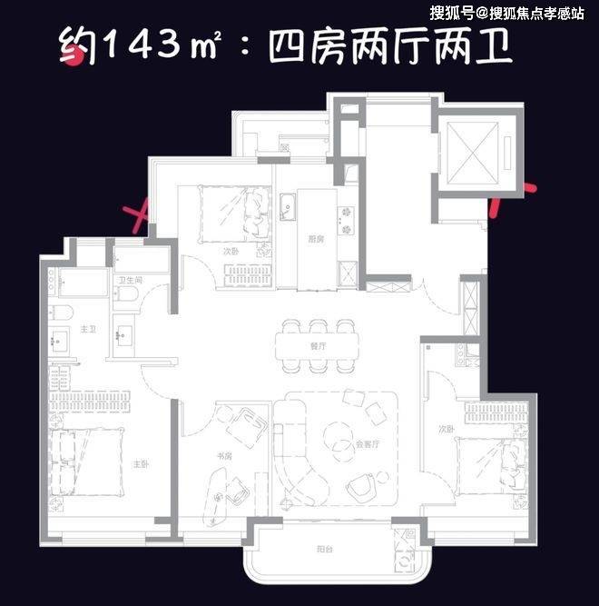 143平4房2厅2卫,采用飞机户型设计,四开间朝南,南向面宽约13.5米,总价预计1500多万起步。
