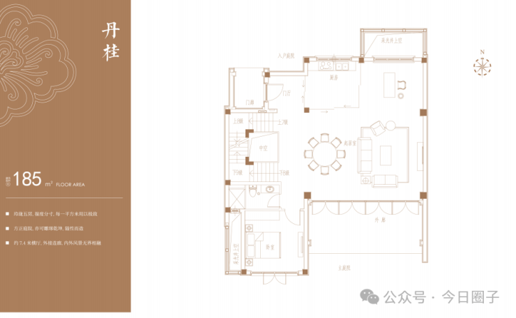 据销售介绍,房屋实际可用面积要比户型图标注面积大一些,以“丹桂”户型为例,户型图标注的建筑面积为185m²,但是层高达到9.9m,未来完全可以搭建二层,搭建后,地上使用面积可以达到约280m²左右。