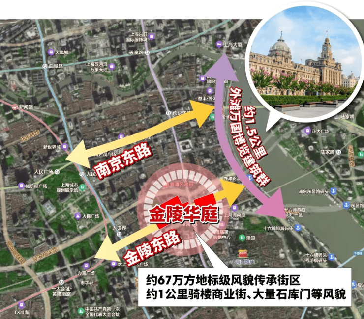 “出则繁华,入则静谧”,这句话在金陵华庭身上得到了完美诠释。项目位于黄浦区金陵东路核心板块,与外滩直线距离仅26米,步行15分钟即可踏上滨江步道,俯瞰黄浦江两岸的璀璨夜景;向东10分钟步行可达豫园商城,感受老上海的市井烟火;向西8分钟至人民公园,在10万㎡绿地中享受城市绿洲。