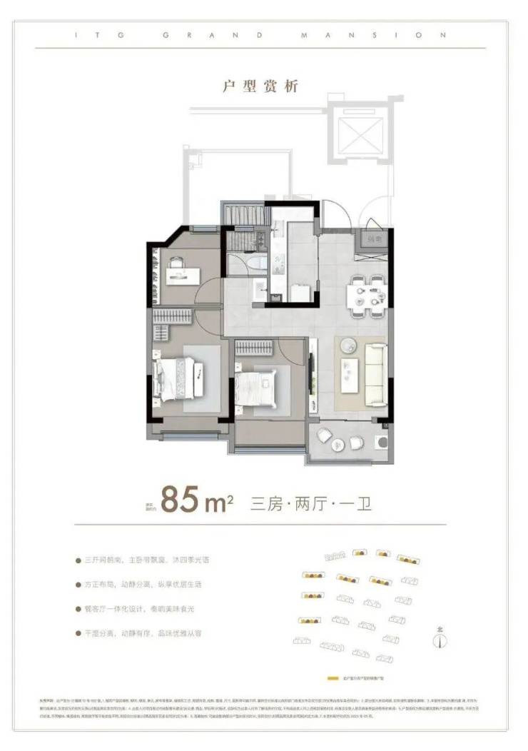 「建面约85㎡3房2厅1卫」