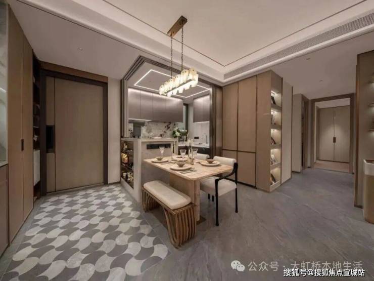 此外,项目全屋采用岩板铺装,从玄关、餐客厅到厨房、卫生间,抗污防潮好打理,银杏纹样拼花更添质感。