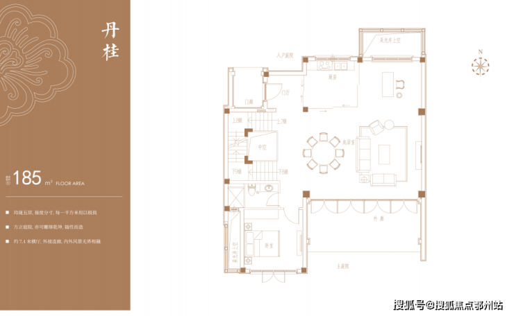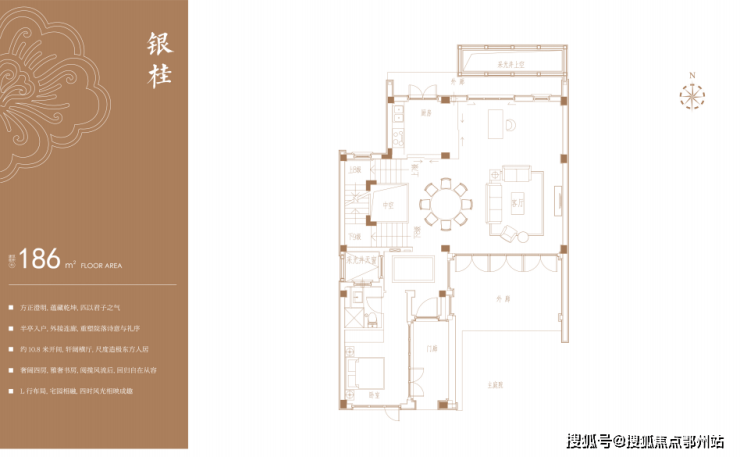 建面约175-380㎡合院:涵盖月桂(177㎡)、丹桂(185㎡)、银桂(186㎡)、金桂(205㎡)及龙梅(788㎡)。