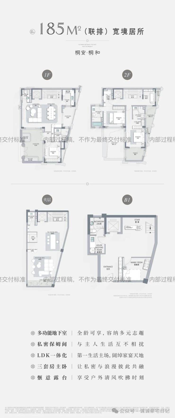 桐安里由招商操刀建设,整体布局为地上2-3层+阁楼+花园+地下1层(挑高6.6米)、可分隔成两层,物业使用的是招商最高级的积余物业(地上18元/地下9元),项目整体将于2026年底交付。