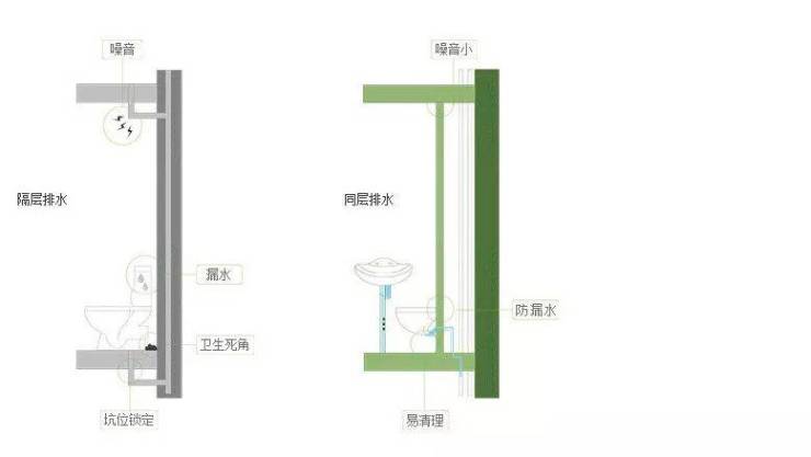 这样的设计大大节约了室内空间、美化了视觉效果,同时消除卫生死角,防止异味。各种管道不穿越楼板,上下住户无干扰,做到静音排水,告别噪声。
