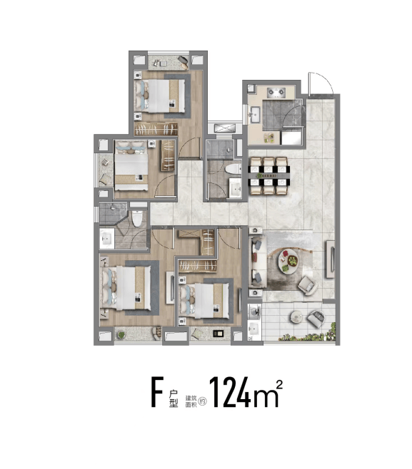 还有建面约124平四房,市面常见的四房普遍要135平,这个约124平米户型功能性拉满,且控制了总价,给予更多小伙伴一步到位的机会。