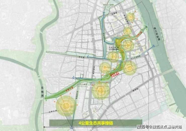 其中,4公里长的生态共享绿链连通珠江后航道和花地河,将重塑江岸、涌岸、路岸的生态景观。
