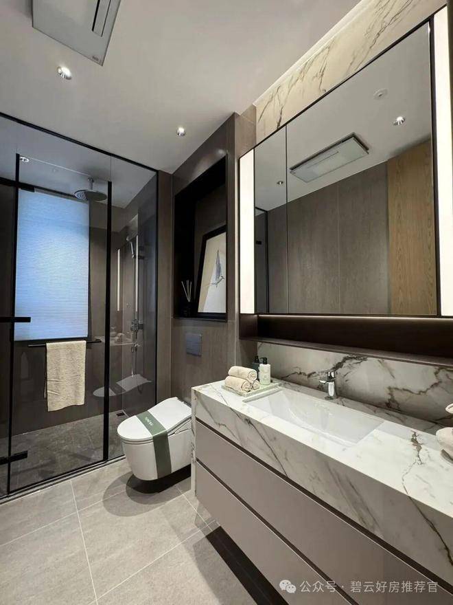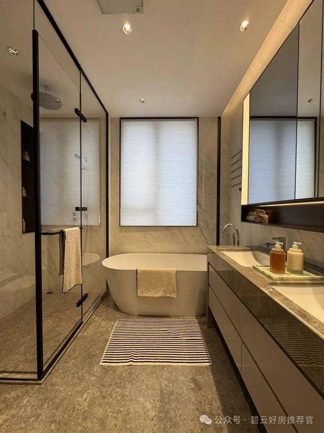 第三,3间套房的设计能满足各个家庭成员的隐私。尤其是主卧,尺度超大,并配置了双台盆+浴缸+淋浴+马桶豪华四件套,还有超大步入式衣帽间。