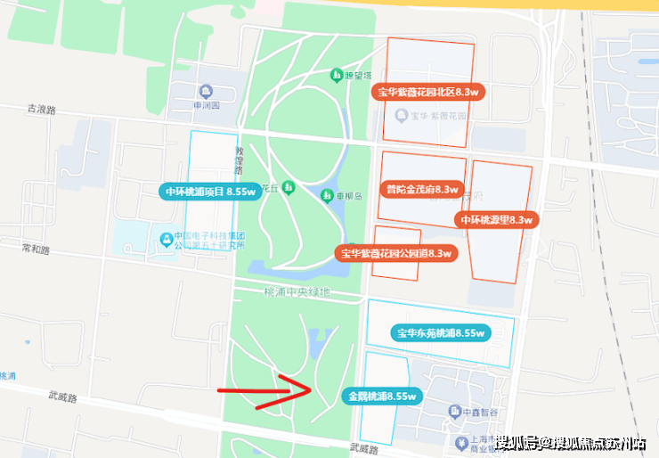 整个项目包含两个地块,地理位置就在宝华紫薇之星南侧,联动价8.55万元/㎡。这块地是2023年四批次土拍时由金隅地产拿下,也是紧挨桃浦绿地的景观房。