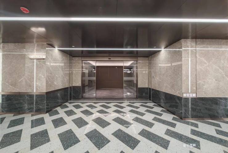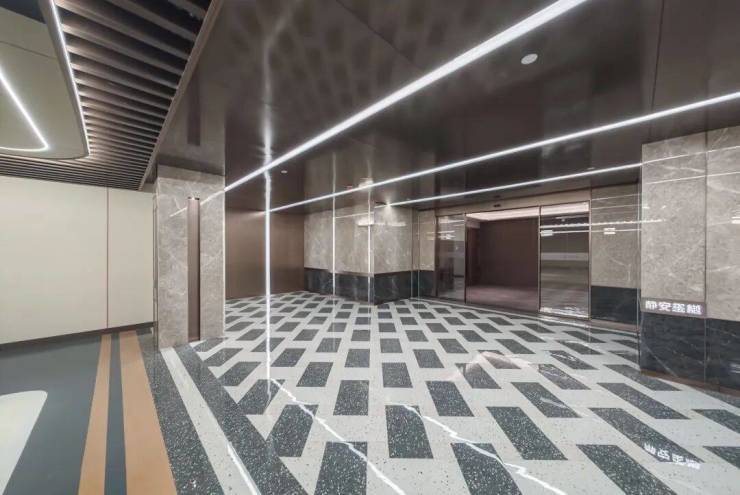 立柱采用石材包边,地坪采用水磨石、水晶漆、大板砖,地下管道和局部区域做了二次包裹,香槟金铝板搭配格栅吊顶,礼序感、视觉效果一流;停车区域地面采用超耐磨地坪,更耐压防滑,静音环保;三合一门禁更增添了业主私密性!