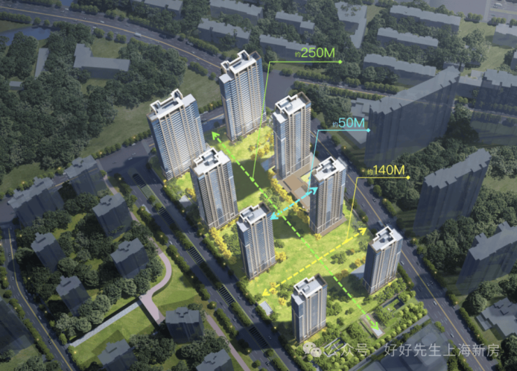 更关键的是主景观轴——纵向约250m、横向约140m,楼间距约50–57m,这在市区紧凑地块里极为少见。