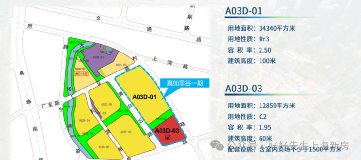A03D-01地块:出让土地面积34340平方米,土地用途为普通商品房,规划容积率2.5,计容建筑面积85850平方米。