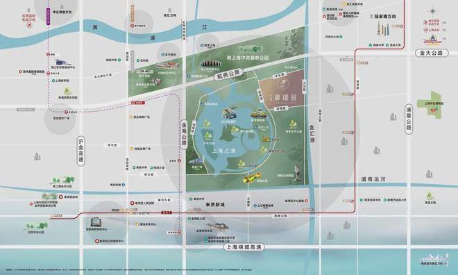 项目位干上海之鱼内,东侧是极具特色的金汇港,水脉碧波倒映生态景观。坐拥约万亩林地,占地面积约4.78平方公里南上海中央公园,更拥享上海之鱼约13公顷环湖景观带和集艺术展览、活力健身、娱乐休闲、游憩观赏为一体的现代城市公园群。