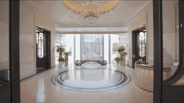 预接待厅地面瓷砖采用威尼斯白与爵士白石材拼花设计,纯人工铺装保证花纹的奢华质感。