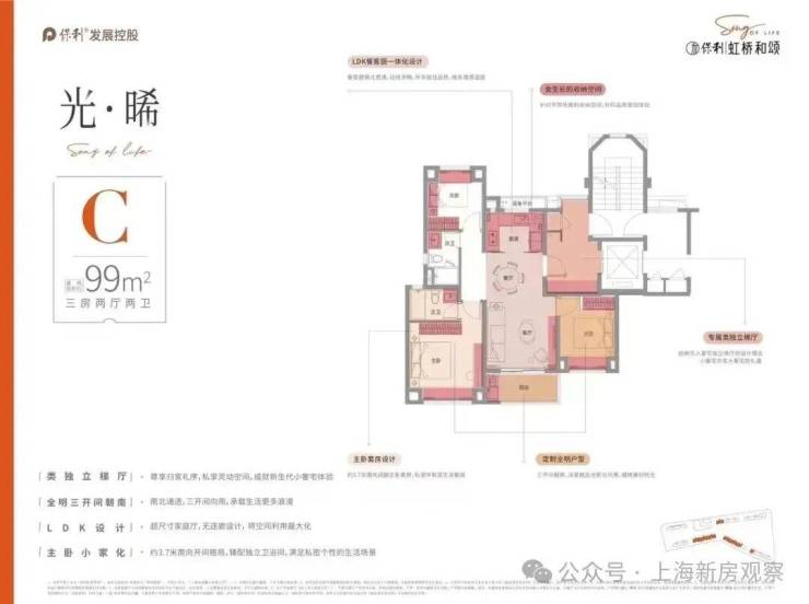 建面约99㎡3房2卫户型不仅保留三开间朝南和餐客厅一体化的优势,更在尺度上大踏步进阶。主卧面宽高达约3.7米,客厅面宽高达约3.75米,适配有尺度改善需求的客户,而市面上同面积段产品尺度基本为客厅面宽约3.5米,主卧约3.3米。