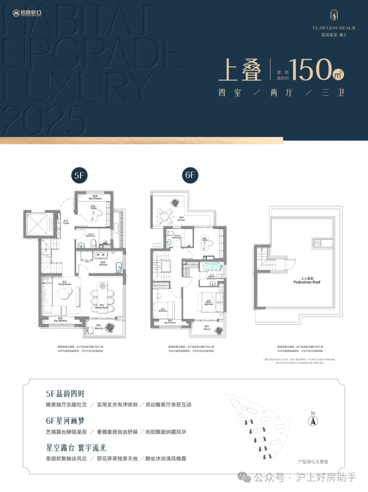 建筑面积约150㎡上叠整层主卧增设优化,自带书房+南北露台,顶楼设有大尺度可上人屋面,既可与亲朋欢聚畅谈风云,也可莳花弄草独享天地。
