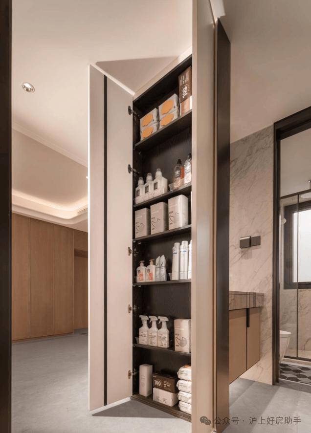 双薄柜设计则大大增加容纳空间,举例来讲,可容纳约200包纸巾,足以满足全家1年使用。而洞洞板设计,则可收纳清洁工具、长柄伞等大件日常用品,如此贴心布局,保证室内物品足够井然有序,也更为利于家庭日常打扫。