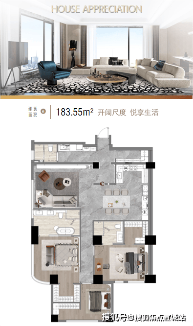 户型:有 183㎡三房两厅两卫和 272㎡四房两厅三卫等户型。183㎡户型三开间朝南,主卧套房带独立衣帽间与全明卫浴;272㎡户型南北通透双套房设计,赠送南北双阳台约 15㎡。