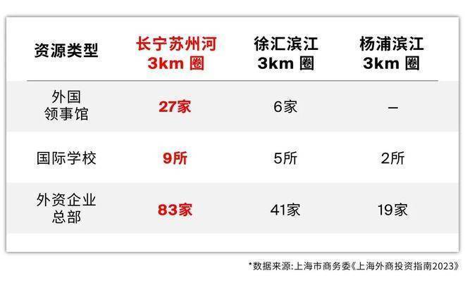 据上海市商务委《上海外商投资指南2023》数据显示,长宁涉外资源密度是徐汇滨江的2-3倍、杨浦滨江的4-10倍,是能够支撑国际客群支付溢价的!