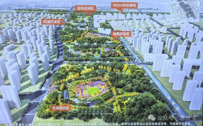 整座公园(在建中)划分为:湿地花园区、鸣湖共享区、林荫跃动区和社邻园艺区,四大功能分区。