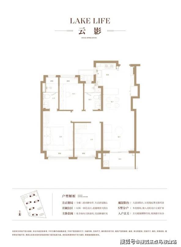 建面约96㎡3房2卫户型,三开间朝南,全卧室带飘窗。户型的采光、视野非常出众。主卧套房设计,保证私密空间。S型的分户墙,褪去呆板,为家具预留更多的空间;经典的餐厨客厅一体的大客厅,作为“家庭厅”使用,可作为亲子游戏、娱乐健身等空间。
