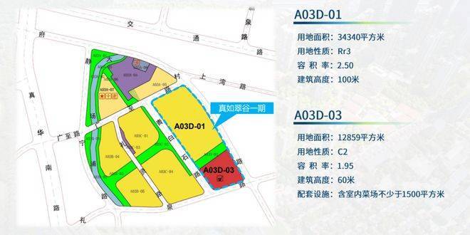 A03D-03地块:出让土地面积12859平方米,土地用途为商业,规划容积率1.95,计容建筑面积25075平方米。