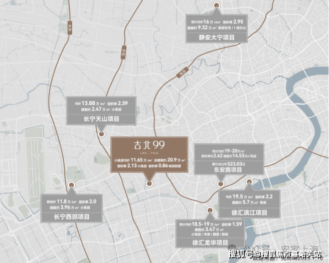 古北99规划用地面积96317㎡,总建筑面积约21万㎡,其中住宅约9.6万㎡,商业约0.7万㎡, 住宅户数457户。产品包括3栋高层(约285套)和172套联排别墅。