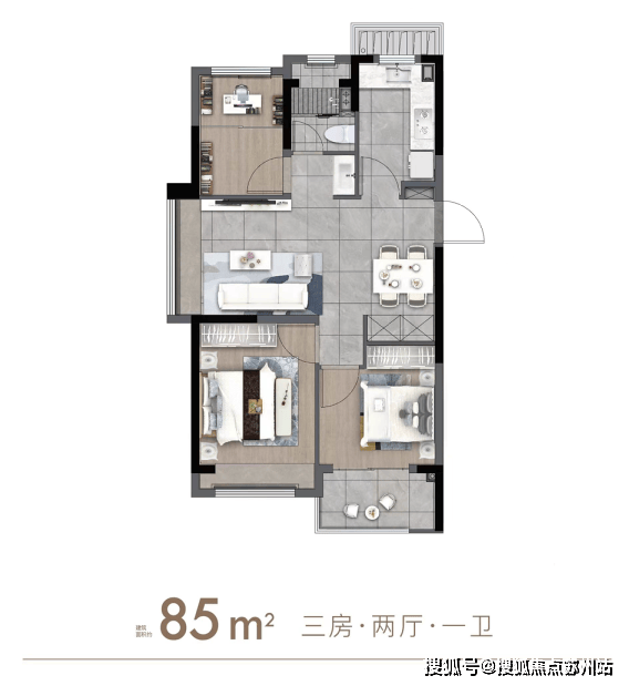 「建面约85㎡3房2厅1卫」