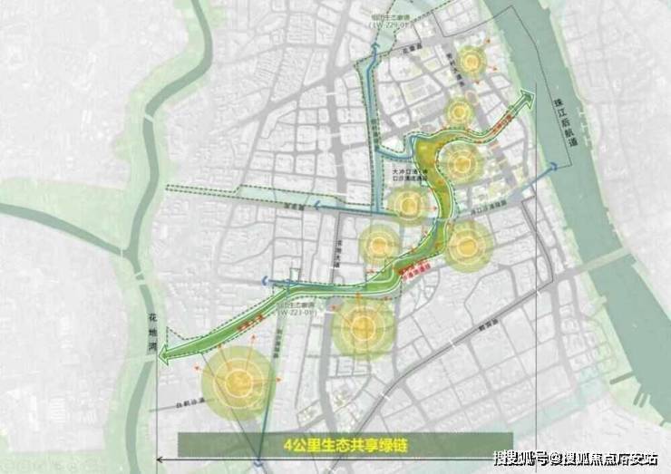 其中,4公里长的生态共享绿链连通珠江后航道和花地河,将重塑江岸、涌岸、路岸的生态景观。