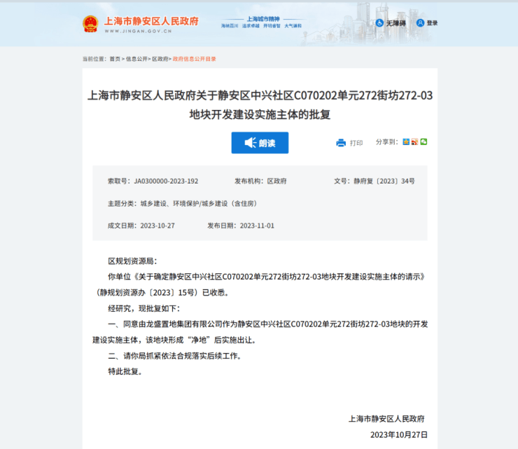 同意由龙盛置地集团有限公司作为静安区中兴社区C070202单元272街坊272-03地块的开发建设实施主体。
