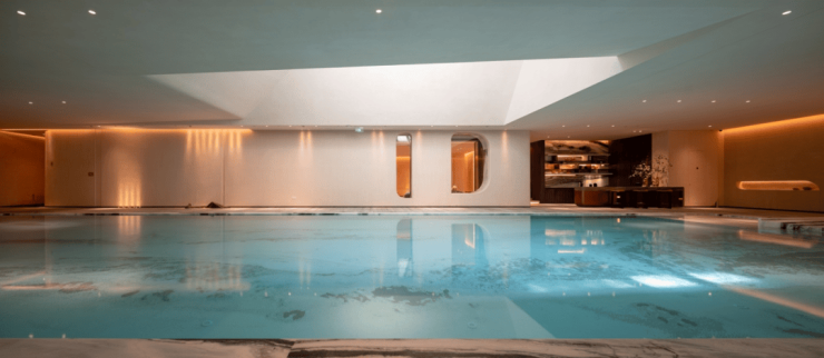 山水庭院之下就是会所,深入内部,则是一座设计灵感来自于罗马浴场的豪华泳池,天光破顶而下,一边是宏伟而精致的欧陆风情,一边是溪山行旅图的东方意韵,当你在池中游弋时身体划过的是一部浓缩的东西方文明史。