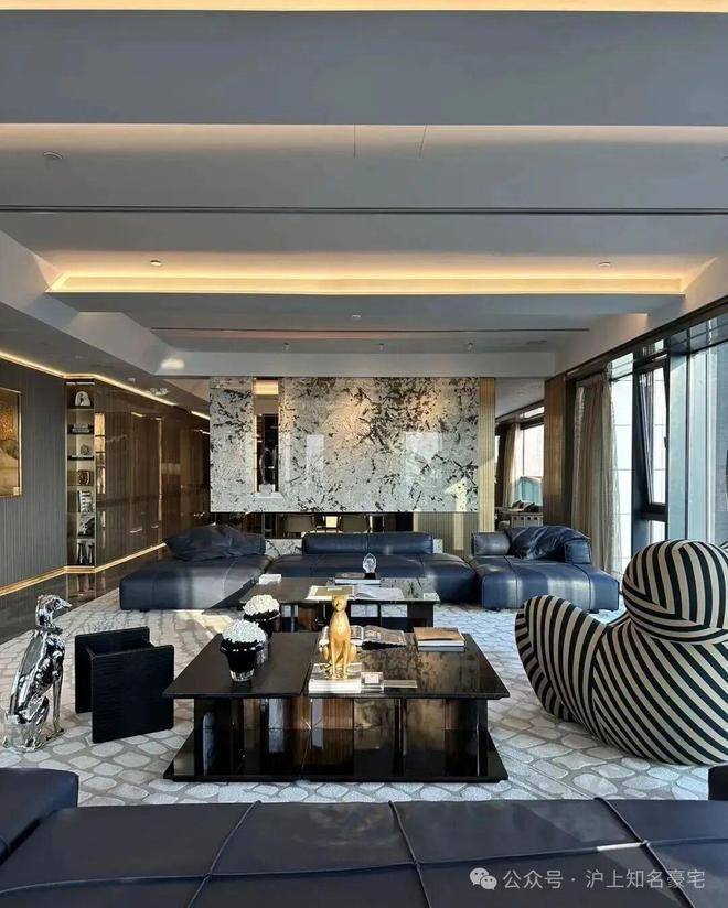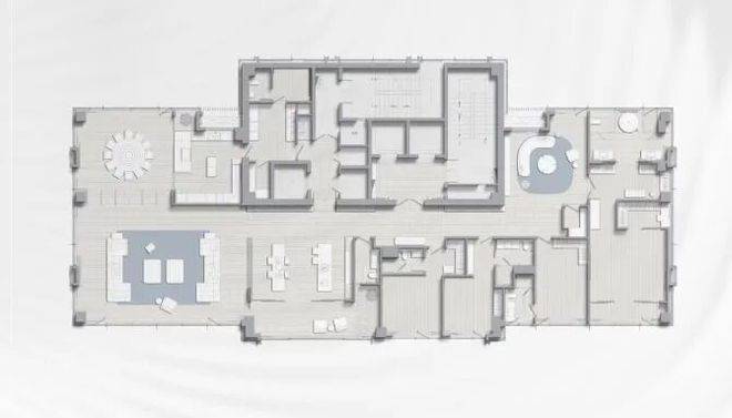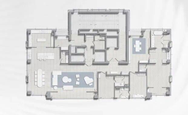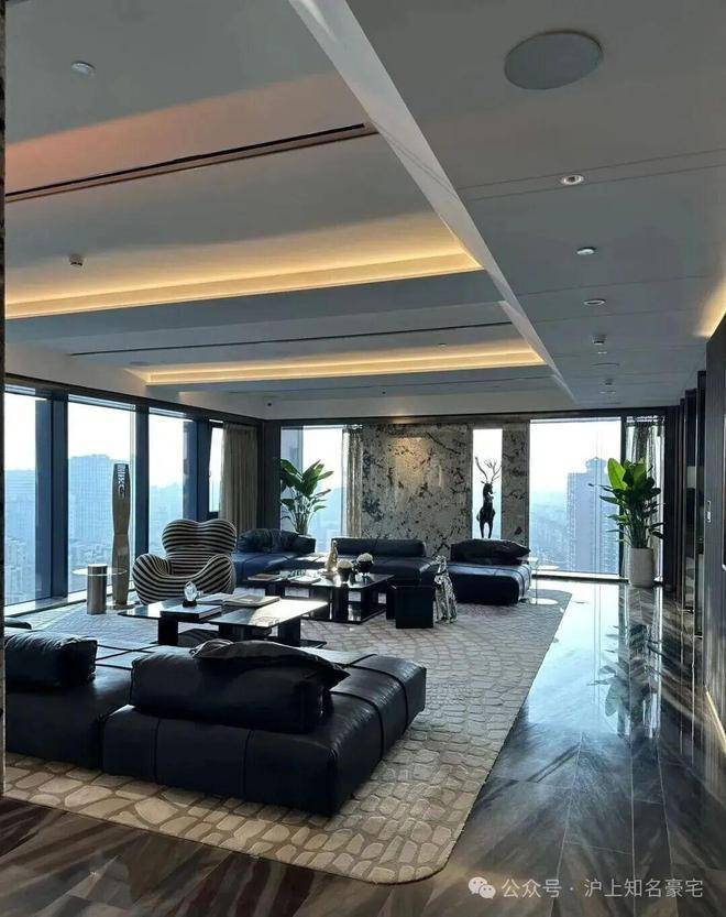 该户型呈三梯一户的设计,同样是约3.6米的奢阔层高,朝南横向跨度超37.3米,会客厅面宽超18.5米,空间奢阔;户型东、南、西三面全景玻璃幕墙,超270度环幕视野景观震撼!