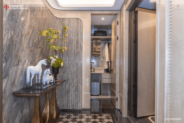 私密的本质,是空间对身份的认证。外滩道以“一梯一户”为起点,通过约6.5㎡独立电梯厅与独立玄关,构建双重空间缓冲:电梯厅承接社交往来,玄关收纳尘世琐碎。东向整面墙的收纳系统,让归家成为一场从喧嚣到宁静的身心过滤。
