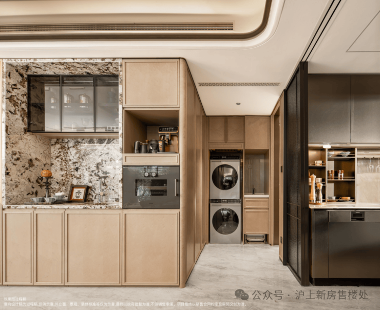 还交付一体化餐边柜,收纳能力惊人;同时该户型还配备专属家政空间,邻卫生间,动线更流畅,彻底解放阳台,阳台不用晾晒,完全用于观景或志趣空间。