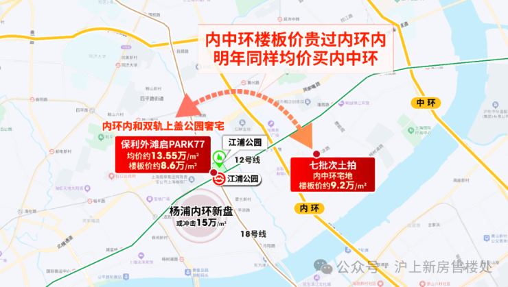 杨浦内环12/18号线江浦公园站双轨上盖,保利外滩启PARK77火热在售中!总价1200万起!