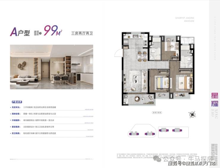 整体为 三开间朝南,客厅拥有近似百平产品的面宽感受。这个尺度,在同面积段产品中非常罕见。