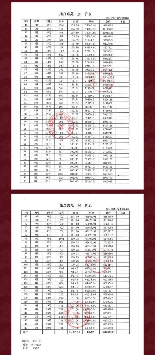 一房一价表: