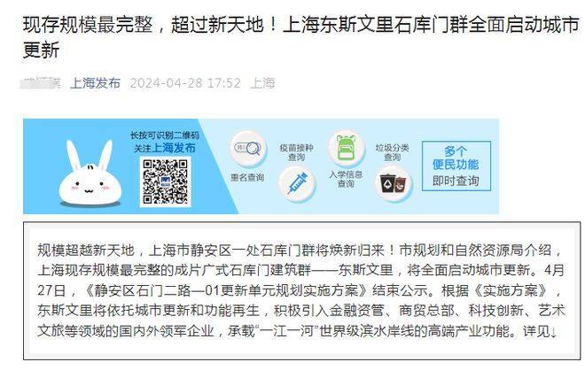要知道项目与东斯文里世纪规划仅一路之隔!上海发布对东斯文里的规划概况下来12个字:现存规模最完整,超过新天地!