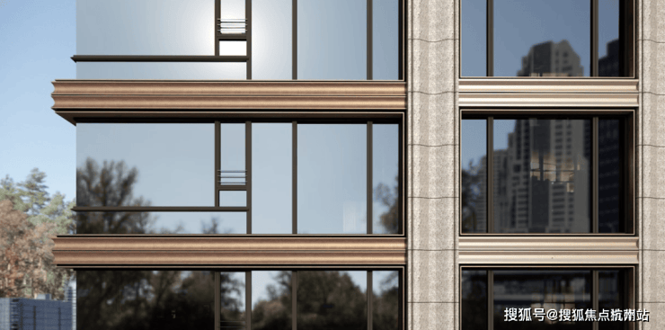 选用石材、铝板等高品质材料,古铜色金属与通透玻璃搭配,结合专属定制单元门及中式挑檐,只为业主归家的一抹温暖质感。