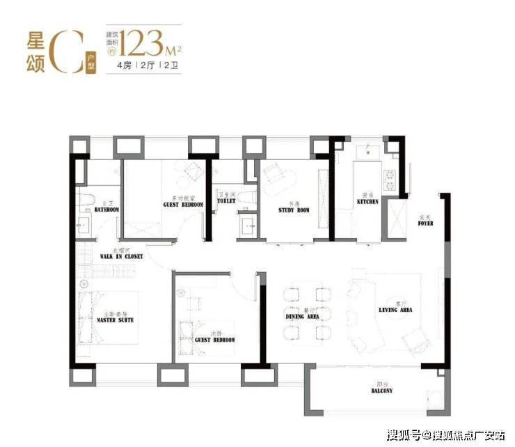 建面约123-129㎡真四房,这个户型的南向面宽和尺度感堪比一般的别墅。