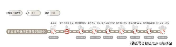 轨交网络:5号线、15号线南延伸段(在建中)、市域嘉闵线南延伸段(规划中)、沪乍杭高铁(规划中)及南枫线(在建中)