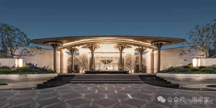 项目恢弘大气的门头,项目设计师以浮岛为灵感,将几根立柱化作悬浮的雕塑,撑起一片轻盈的仪式感。
