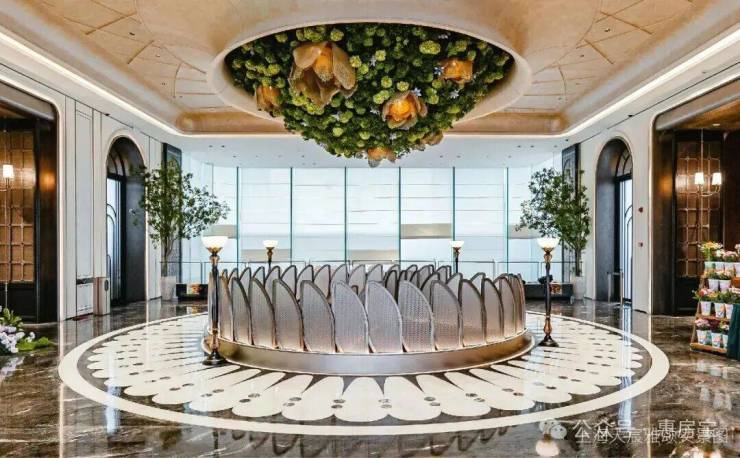 让自然的气息在室内流淌,在阳光与空气的轻抚下,为空间注入生机与灵动。负一层浅洽谈区中一丛丛似锦繁花,营造出湿润绿林的微气候,光线温柔洒落,与花卉艺术品相映成趣。墙面艺术画作中抽象化的自然雨林,以浓烈的色彩与肌理,呼应着东西方园林共有的,对生命丰饶与形式美的极致颂扬。